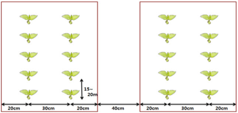 이랑에 2줄로 재배할 때 포기 간격(주간거리)은 15cm∼20cm 정도로 구멍 한 곳당 참깨 종자를 4알∼5알씩 심으면 적당하다.