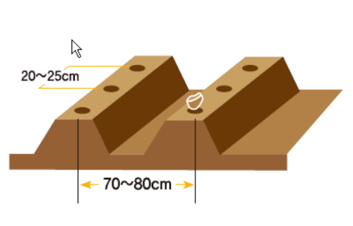 감자심기 전에 이랑 사이를 70~80cm정도로 하고 깊이 20cm정도의 골을 파서 그속에 1㎡당 퇴비를 1.5kg, 복합비료를 0.3kg정도 뿌린다.