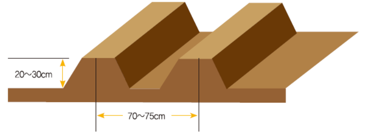 이랑사이의 간격은 70~75cm정도로 하여 두둑을 만들고 포기 사이의 간격은 15~25cm로 하되, 이랑사이의 간격이 넓어 두둑이 클경우 포기사이의 간격을 좁힌다.