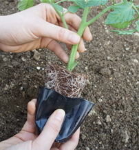 | 모종을 빼기 전에 비닐 컵을 살짝 주물러 주어 뿌리가 다치지 않게 빼낸다. | 뿌리가 잘 내리고 본잎이 6~10장 난모종, 웃자라지 않은 모종으로 모종 사이 30~50cm 간격으로 뿌리부분보다 크게 땅을 파서 심는다. | 흙을 덮어주고 모종이 고정될 정도로만 눌러준다. | 심은 후 모종 주변으로 땅이 파여 뿌리가 보이지 않도록 조심하면서 물을 흠뻑 준다. |