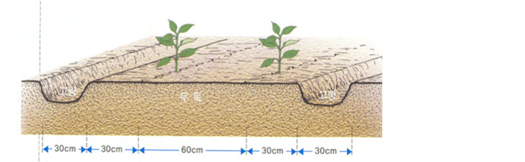이랑 넓이는 120cm 정도로 하여 2줄로 심는 것이 관리하기 편하다.