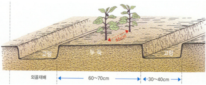 한 줄 심기를 할 때는 포기와 포기 사이를 40~50cm 간격으로 심고, 두 줄 심기를 할 때는 줄 간격은 60㎝, 모종의 간격은 40㎝로 하여 3.3㎡당 10주 정도가 심기도록 심는다.