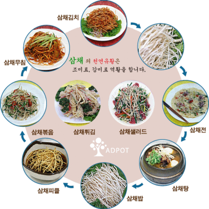 그렇기 때문에 삼채는 그냥 씹어 먹어도 맛있고 무침이나 삼채김치, 삼채전, 삼채튀김, 삼채즙 등 우리의 입맛에 따라 다양한 음식을 만들 수 있습니다.