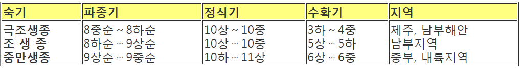 기온이 일찍 상승하는 제주 및 남부 해안지역에서는 조생종 품종을, 내륙지방으로 갈수록