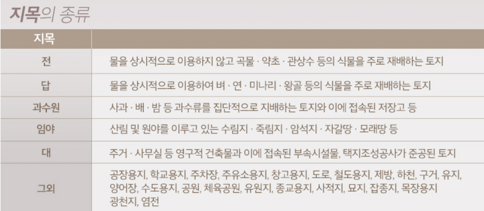 지목(地目)이란 토지의 주된 사용 목적에 따라 28가지로 구분한 명칭이다. 전, 답, 유지, 도로, 과수원, 목장용지 등으로 나뉘며 각각의 지목은 과세 기준으로 쓰인다.