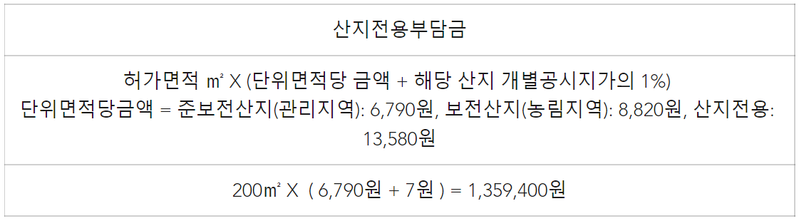 산지전용의 경우는 농지전용비가 공시지가의 30%인 겻과는 달리 전국적으로 매년 산림청에서 고시하는 산지전용비 기준에 따라적용을 받는다. 평균 ㎡당 2,000원. (평당 공시지가와 상관없이 만원이 넘지 않는다.)