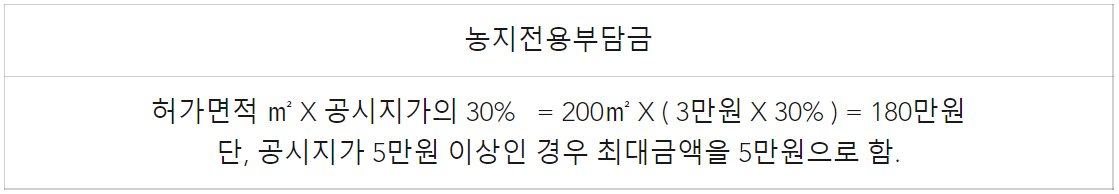 농지보전부담금 = 전용하고자 하는 면적 (㎡) * <개별공시지가 * 30% > 단/ ㎡당 공시지가 상한가 50000원.