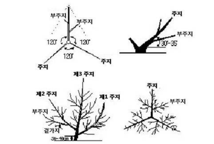 주지를 3개로 할 때는 각각 120도의 방향으로 배치하되 개개 나무의 제1주지는 과수원 전체로 보아 같은 방향으로 배치되도록 한다.