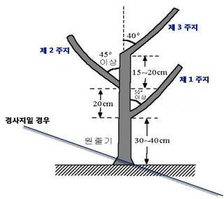 경사지에서는 제1주지의 분지 위치를 20㎝이하로 하고, 제1주지는 경사의 아래쪽으로 신장시킴으로써 수고를 낮추고 제3주지를 강하게 유지시킬 수 있는 장점이 있다.