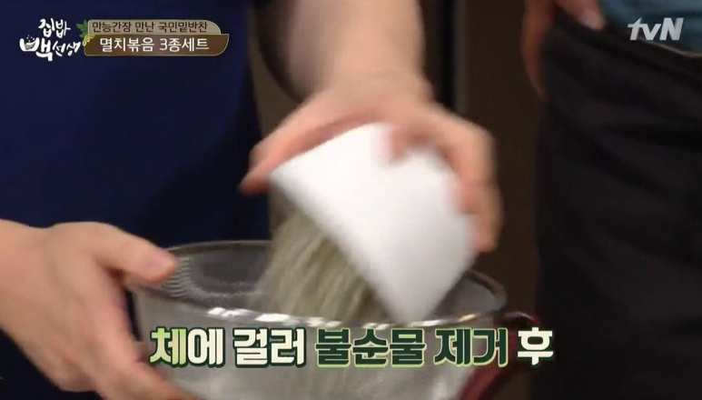 1. 센 불로 달군 마른 팬을 약 불로 줄여 잔멸치 100g을 넣고 1분가량 볶은 후 체를 이용해 부스러기를 털어낸다