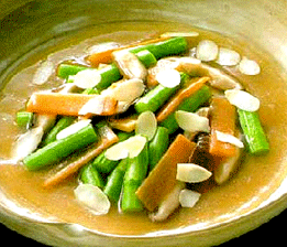 냄비에 샐러드유를 두르고 가열하여 샐러드유가 냄비 속속들이 베게한 후 준비한 아스파라거스를 넣고 살짝 볶는다. 표고버섯, 홍당무를 넣고 같이 볶는다.