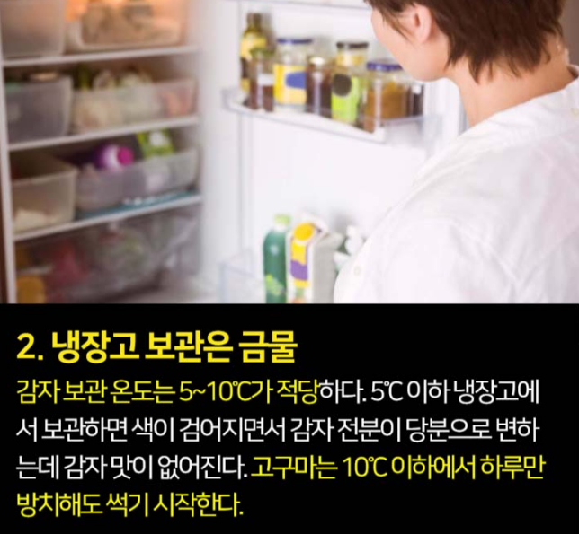감자는 쉽게 상하기 때문에, 가정에서 오래 보관하기가 쉽지 않다. 신문지에 싸서 김치냉장고 같은 곳에 보관하면 괜찮다고 생각할지 모르지만, 오래 보관하지 않는 것이 좋다.