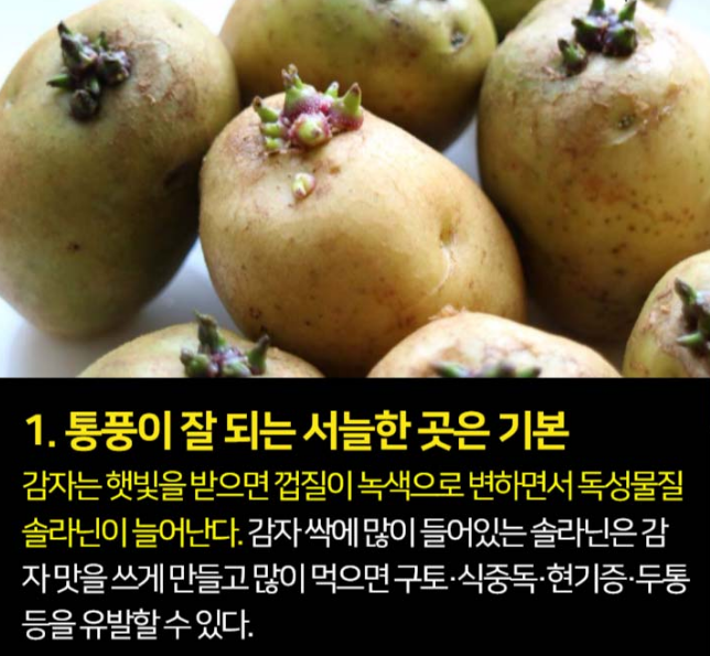 감자의 싹이나 녹색으로 변한 부분엔 솔라닌이란 독성 물질이 있다고 하는데, 구토, 복통을 일으키기도 한다고 한다. 그렇다고 버리지 말고, 이 부분만 잘라내고 먹으면 된다고 한다. 그리고 적당량은 몸속에서 치료제로 사용된다고 한다.