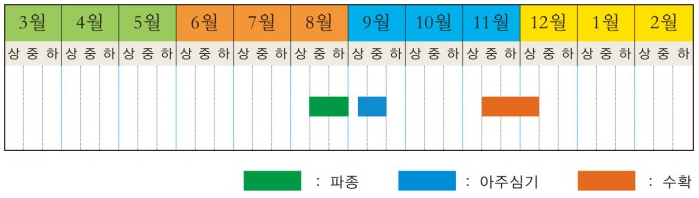 | 가을조기재배 | 8월 상순~8월 중순 | 9월 하순~10월 중순 | 경기 북부 |
