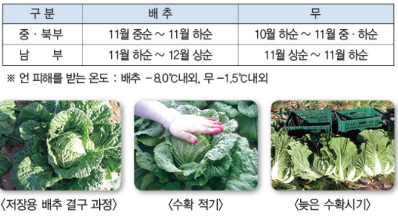 동해를 입는 온도는 무 0℃, 배추 영하 6℃ 정도로 기상예보에 따라 비닐이나 짚을 덮어주거나 배추 포기를 묶어주는 것이 도움이 된다.