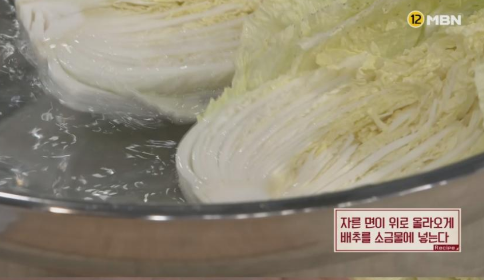 2. 자른 면이 위로 올라오게 배추를 소금물에 넣는다. 배춧잎 사이사이에 소금물을 끼얹는다.