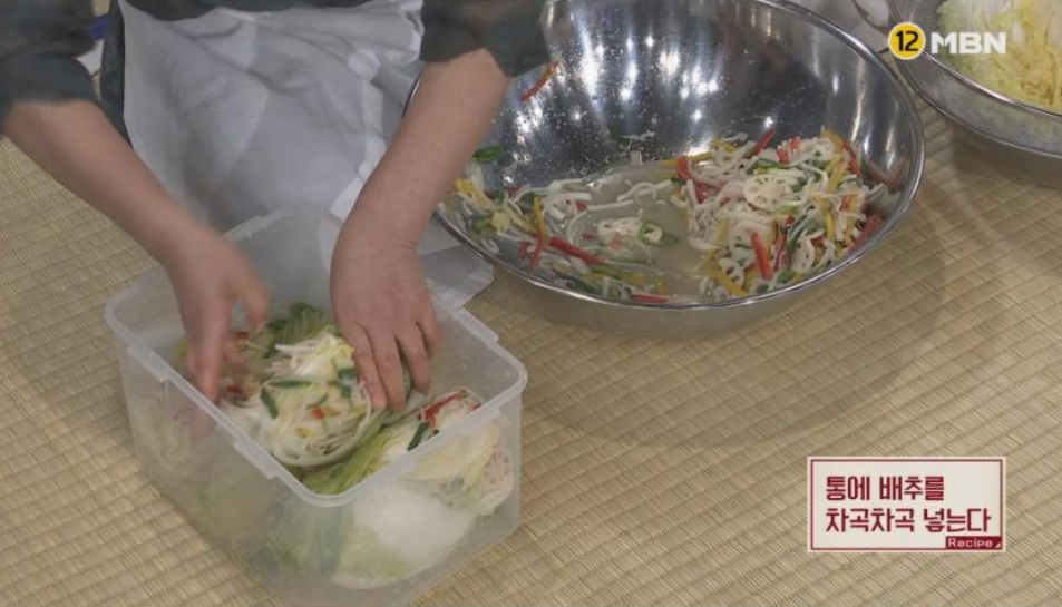 14. 통에 배추를 차곡차곡 넣는다. 남은 김칫소를 백김치 위에 얹으면 알토란 유정임 백김치 맛있게 담는법이 완성된다.
