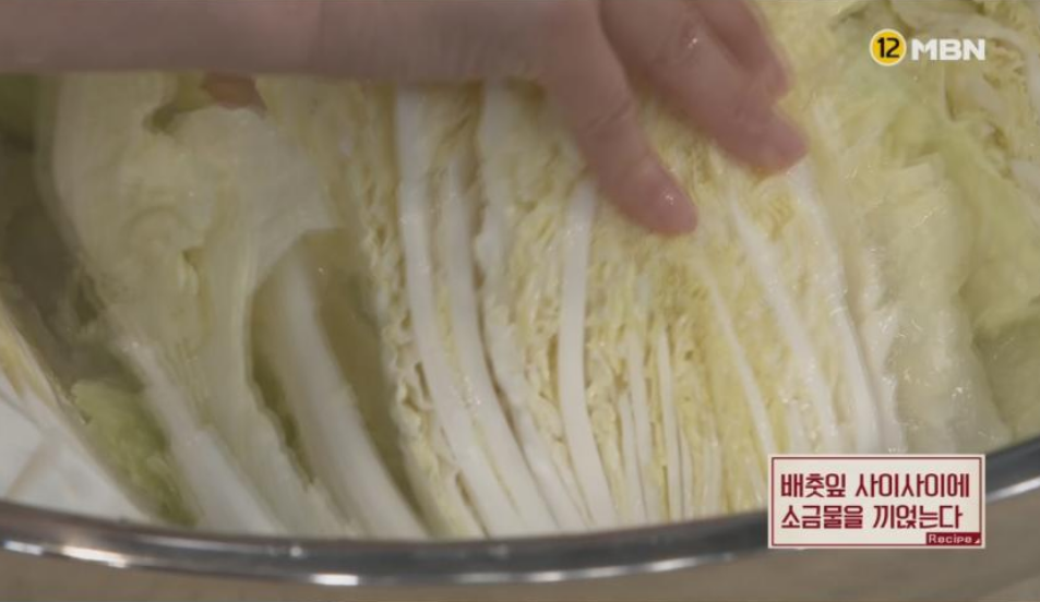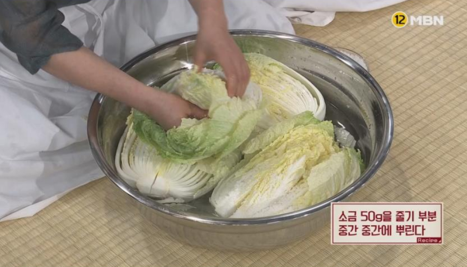 4. 배추의 줄기 사이사이에 소금을 뿌려서 3시간 동안 절인다.