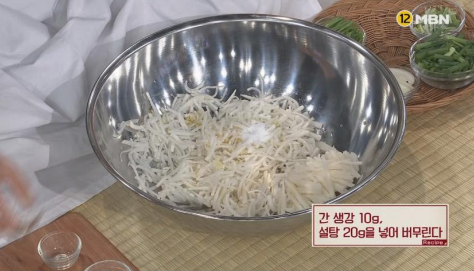 4. 무1kg은 0.7cm두께로 굵직하게 채썬다, 무의 섬유소를 살려 옆면으로 썰어야 식감이 아삭하고 모양이 유지된다