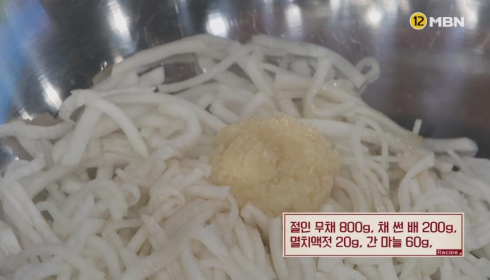 7. 절인 무채 800g, 채 썬 배 반 개(200g), 멸치액젓 20g, 간 마늘 60g, 간 생강 10g, 설탕 20g을 넣어 버무린다.