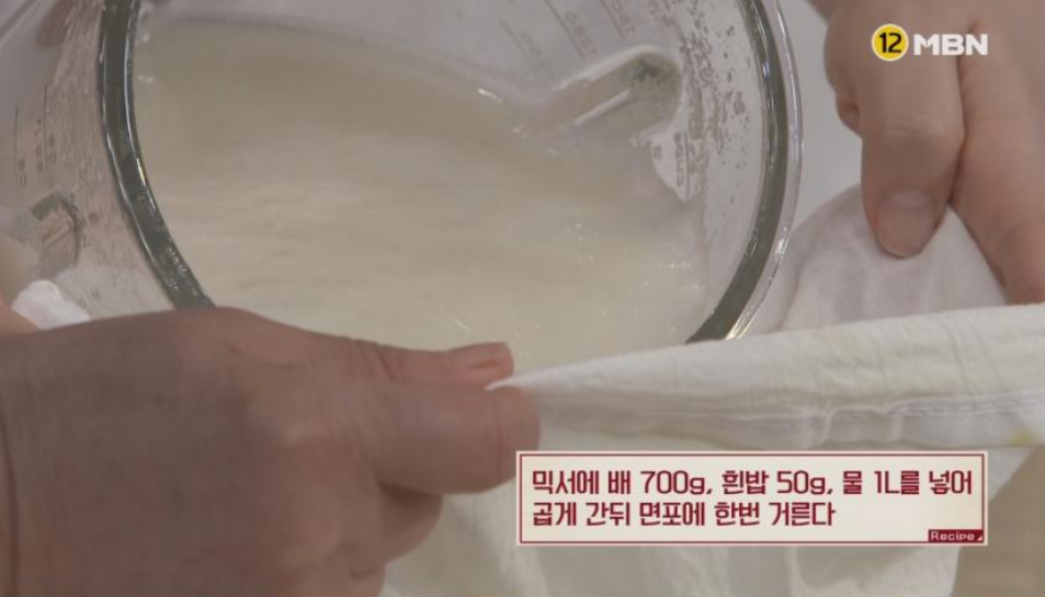 9. 믹서에 배 1개 반(700g), 흰밥 50g, 물 1L를 넣어 곱게 간뒤 면포에 한번 거른다.