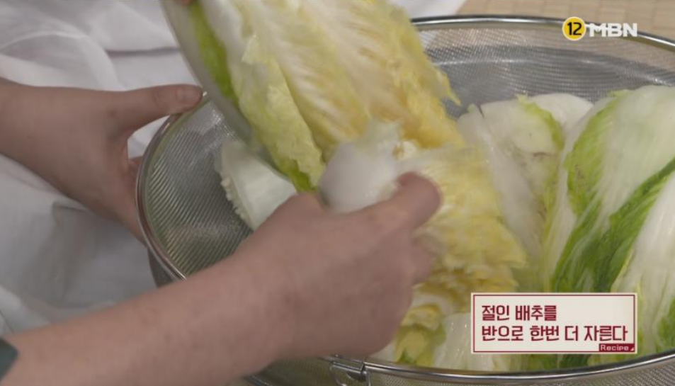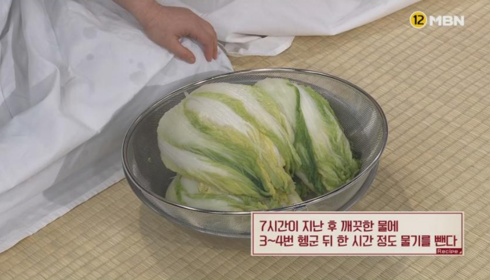 (절인 배추의 물기를 제거해야 군둔내가 나지 않고 깔끔하다,)