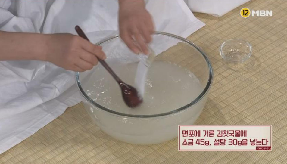 11. 면포에 거른 김칫국물에 소금 45g, 설탕 30g을 넣는다.
