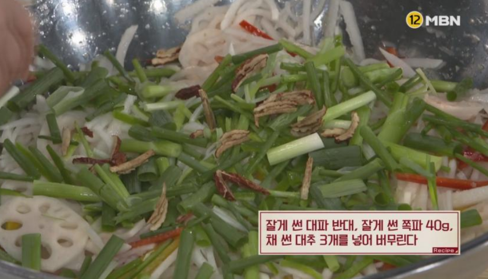 11. 양파 1개를 채 썰고, 쪽파 300g은 5cm 길이로 잘라 넣는다.