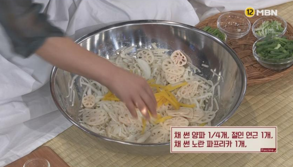 8. 채 썬 양파 1/4개(50g), 절인 연근 1개, 채 썬 노란 파프리카 1개, 빨간 물 뺀 채 썬 빨간 파프리카 1개, 채 썬 아삭이 고추 3개, 잘게 썬 대파 반대, 잘게 썬 쪽파 40g, 채 썬 대추 3개를 넣어 버무린다.
