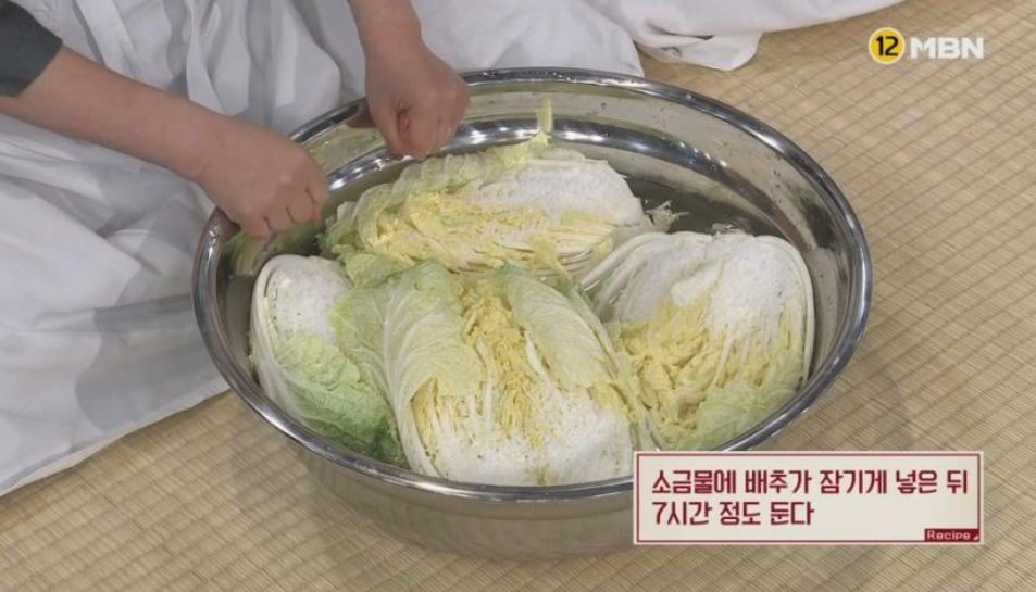 4. 소금물에 배추가 잠기게 넣은 뒤 7시간 정도 둔다.