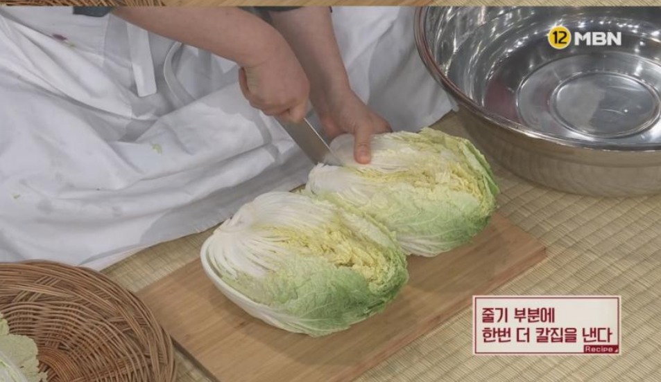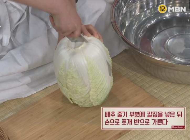 1. 통배추2포기는 밑동에 칼집을 내 손으로 반을 쪼갠다, 2등분 한 배추의 반을 갈라 줄기 부분에 절반만 칼집을 낸다.
