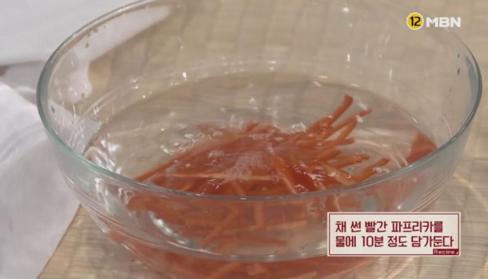 6. 채 썬 빨간 파프리카를 물에 10분 정도 담가둔다.
