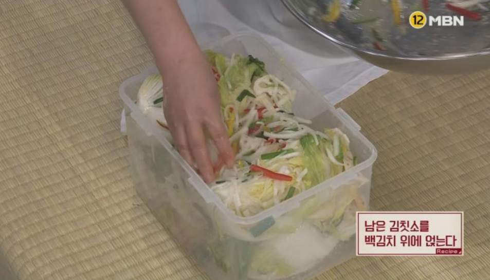 14. 통에 배추를 차곡차곡 넣는다. 남은 김칫소를 백김치 위에 얹으면 알토란 유정임 백김치 맛있게 담는법이 완성된다.