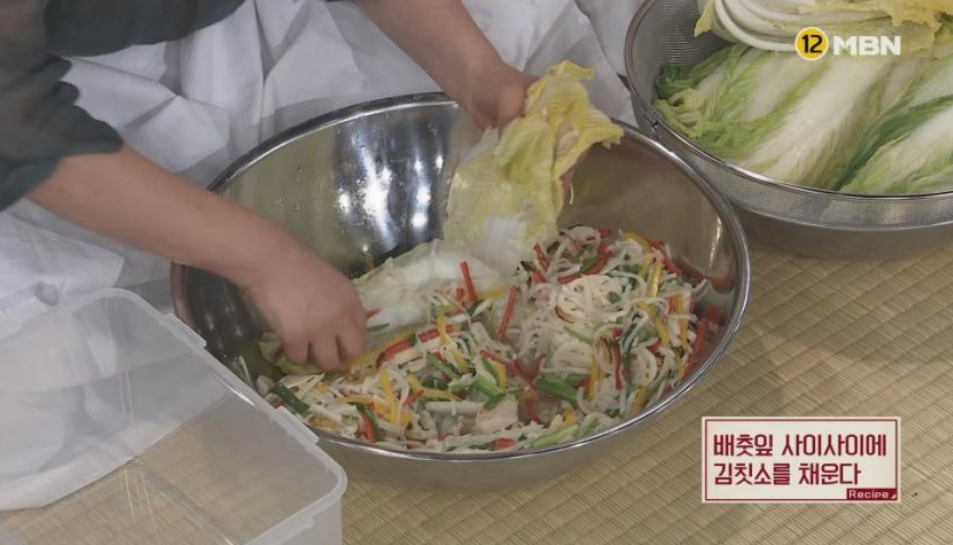13. 배춧잎 사이사이에 김칫소를 채운다. 겉잎으로 배추를 감싼다.