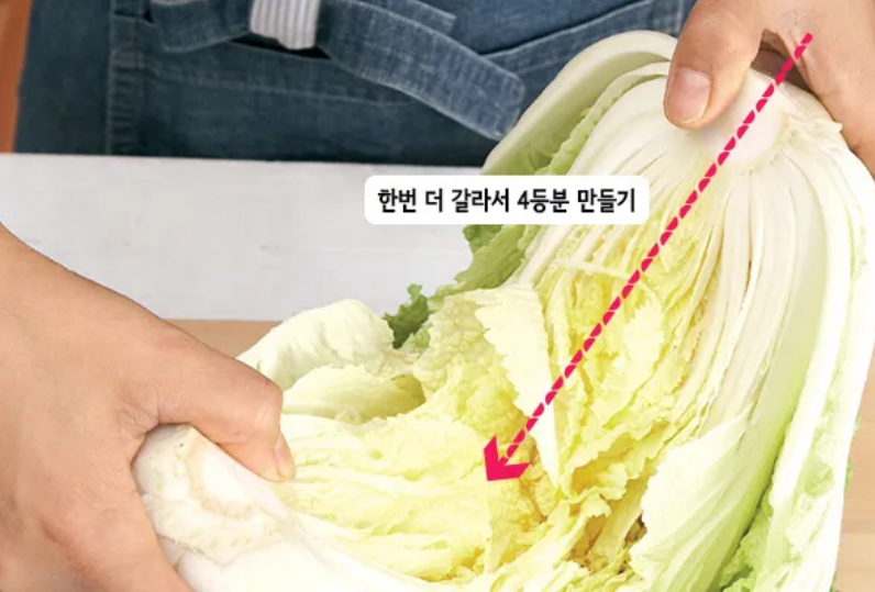 1. 배추의 겉잎을 떼고 반으로 가른 후 심지 부분에 칼집을 넣어 다시 갈라 4등분을 만든다.