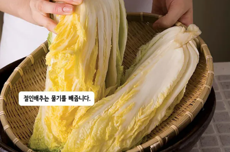 ▶ 백종원 Tip: 절이는 중간 1~2회 위아래를 뒤섞어준다. 배추를 소금으로 염장하는 이유는 유산균이 많아지게 하기 위해서다.