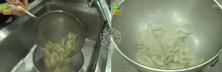 4) 식초를 넣고 2분 후에 불을 끄고 우엉을 찬물에 살짝 헹궈준다.