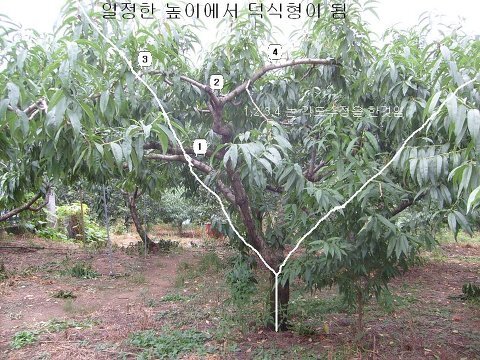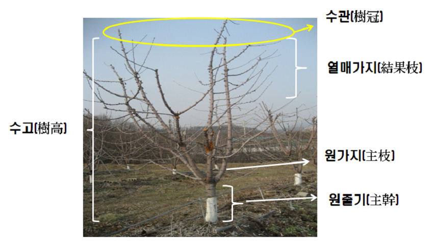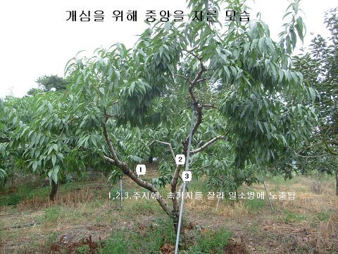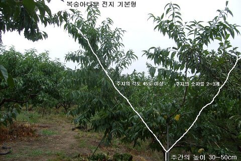 유목은 개심자연형의 수형을 확립하기위해 주간의 높이(30~50cm)와 주지를 만들어 가는 과정이지만 성목은 주지의 연장지 관리와 이미 만들어진 주지(2~4개)를 중심으로 측지및 결과지를 관리하는 것이다.