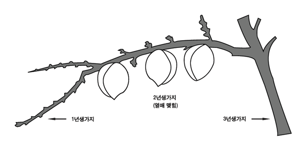길이가 30cm이상 되는 열매가지로서 기부에 2~3개의 잎눈이 있고 중간은 대개 꽃눈과 잎눈이 함께 붙고 잎눈 또는 꽃눈이 있다.