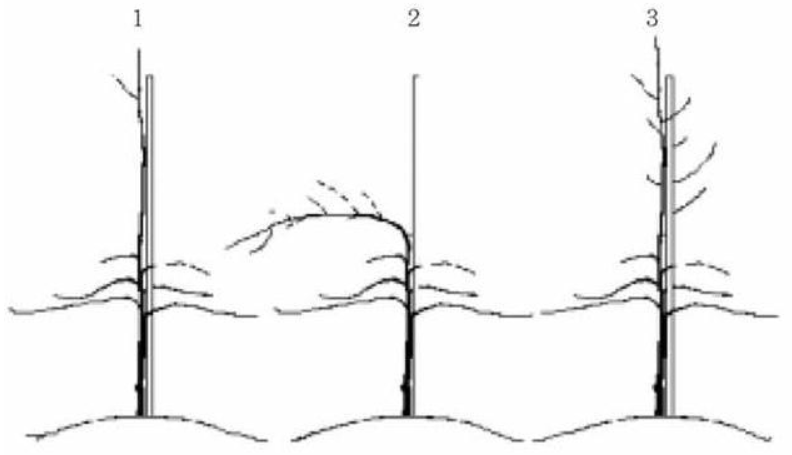 선단부가 30~60㎝ 이상이면 절단할 필요가 없으며 선단이 1m 정도로 잘 자라 있으면, 주간 연장 부분을 수평으로 유인하였다가 유인한 부분에서 새가지가 발생하여 10㎝ 정도 될 때 다시 바로 세워준다.