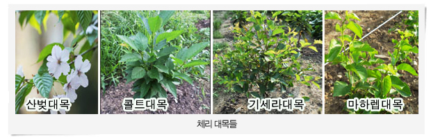 체리나무는 대목의 종류에 따라 생장 규모가 다르기 때문에 체리나무의 묘목을 어떤 대목을 선택하느냐가 앞으로 농가의 재배 관리비와 추후 열매 생산에 직접적인 영향을 미치고 농가수익에도 결정적인 역할을 함으로 대목선택에 신중에 신중을 기해야 한다.