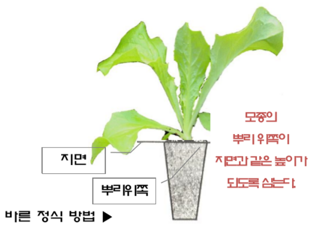 상추는 본엽 3~4매 때가 정식 적기이며, 심을 때는 너무 깊게 심지 않도록 한다. 보통 떡잎이 보일 정도로 정식한다.