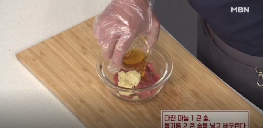 2. 소고기 우둔살을 먹기 좋게 자른 후 다진 마늘, 들기름으로 밑간 한다.