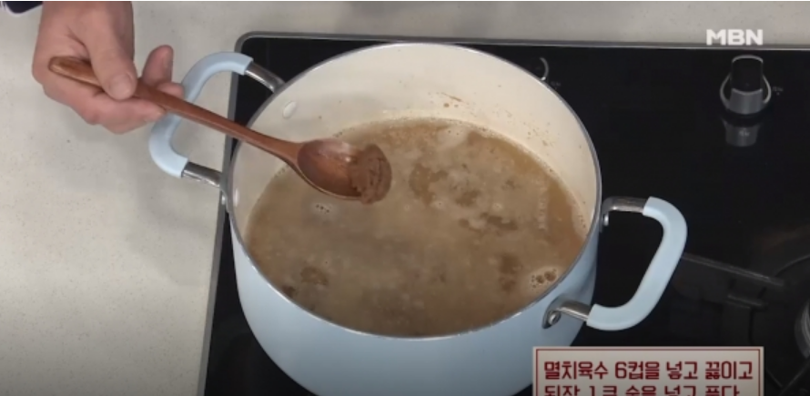 3. 달군 냄비에 소고기를 볶다가 멸치육수, 된장을 넣고 끓인다.