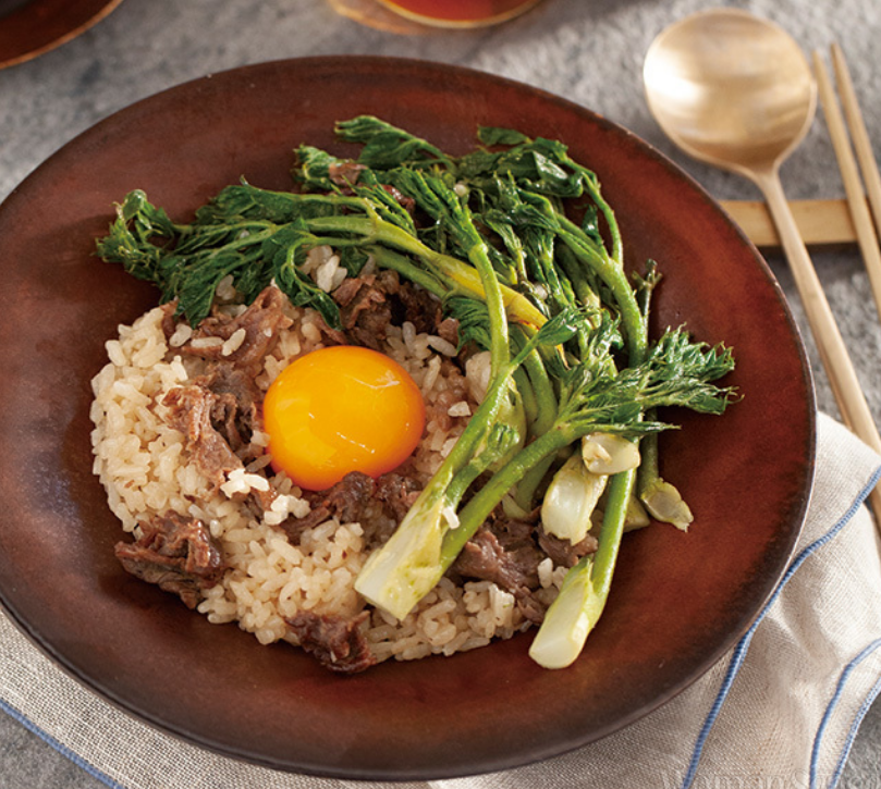 재료: 두릅 100g, 소고기(우둔살, 샤브샤브용) 150g, 쌀 2컵, 멸치다시마육수 2컵, 참기름 2큰술, 간장·맛술 1큰술씩, 소고기 양념(간장 2큰술, 설탕·참기름·맛술 1큰술씩, 후춧가루 약간), 양념장(간장 4큰술, 참기름·고춧가루·통깨·다진 홍고추 1큰술씩, 올리고당 1/2큰술)