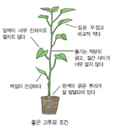 고추 대가 튼튼하고 곧으며 웃자라지 않고 잎이 짙은 녹색으로 윤기가 나는 것이 좋다.