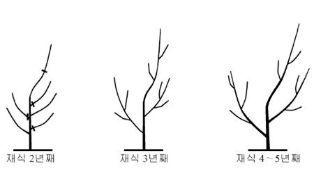 가지치기는 나무의 골격을 만들어 가는 것으로 재식한 묘목의 지상 60~70cm 부위에서 절단하면 선단부위에서 5~6개의 가지가 인접해서 발생하지만 그 아랫쪽에는 발생하지 않으므로 가능한 3~4개의 가지를 간격을 넓게 발생시킨다.