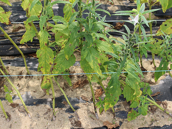 | 시들음병 | 유묘기~수확기 | 새순과 잎끝부터 시들기 시작해 줄기 속이 적갈색으로 변색되고 일부는 줄기 반쪽썩음증상이 나타나기도 함 | 발생 초기부터 10일 간격으로 3회 이내 경엽처리를 하며, 수확 30일 전까지 살포 가능 |