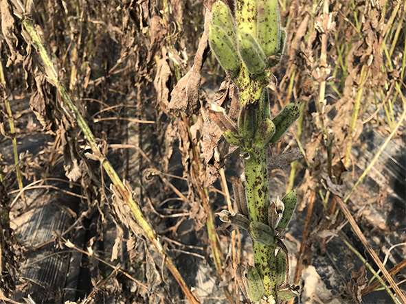| 잎마름병 | 생육중기~수확기 | 잎, 줄기, 꼬투리에 감염 초기 증상은 잎에 자갈색이나 자흑색의 작은 반점이 생기며, 병반이 커지면서 잎이 결국 떨어짐 줄기에서는 갈색의 점선 형태로 보여짐 |