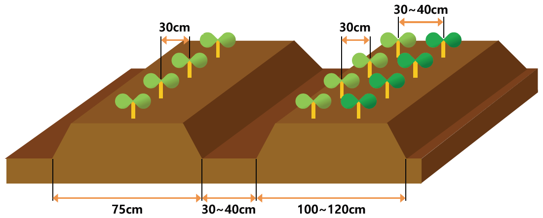1줄 재배는 이랑 너비를 75cm, 2줄 재배는 이랑 너비를 100~120cm로 만들고, 이랑 사이는 30~40cm, 포기간격은 30cm로 합니다. 이랑을 만들 때 흑색 등 비닐을 이용하여 멀칭을 하여 밭 토양의 온도를 유지하고 잡초가 생기는 것을 막을 수 있습니다.